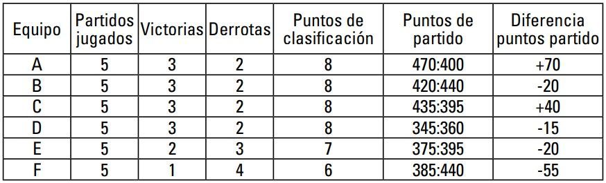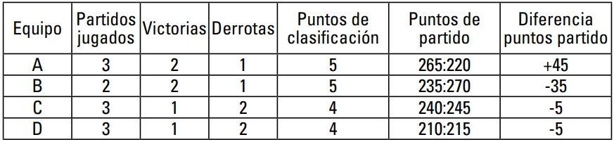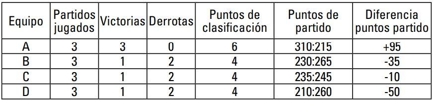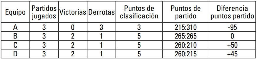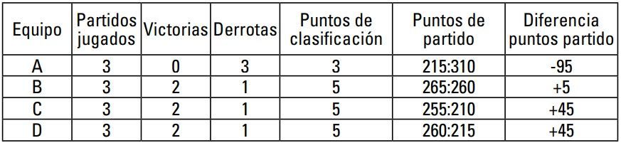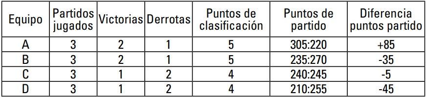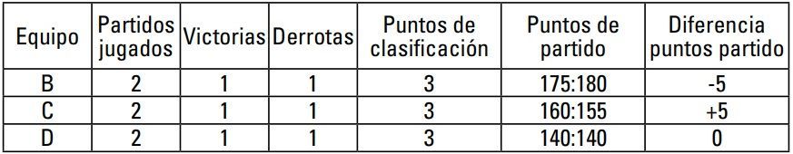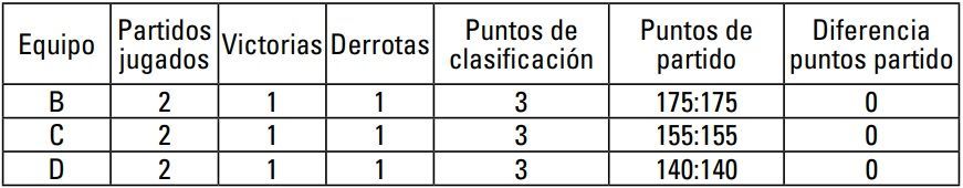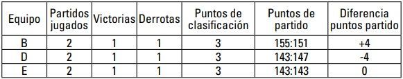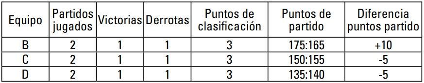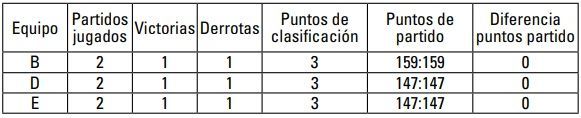 3º Equipo 2A Misma diferencia de puntos de partido que 2C, pero mayor número de puntos de partido anotados.